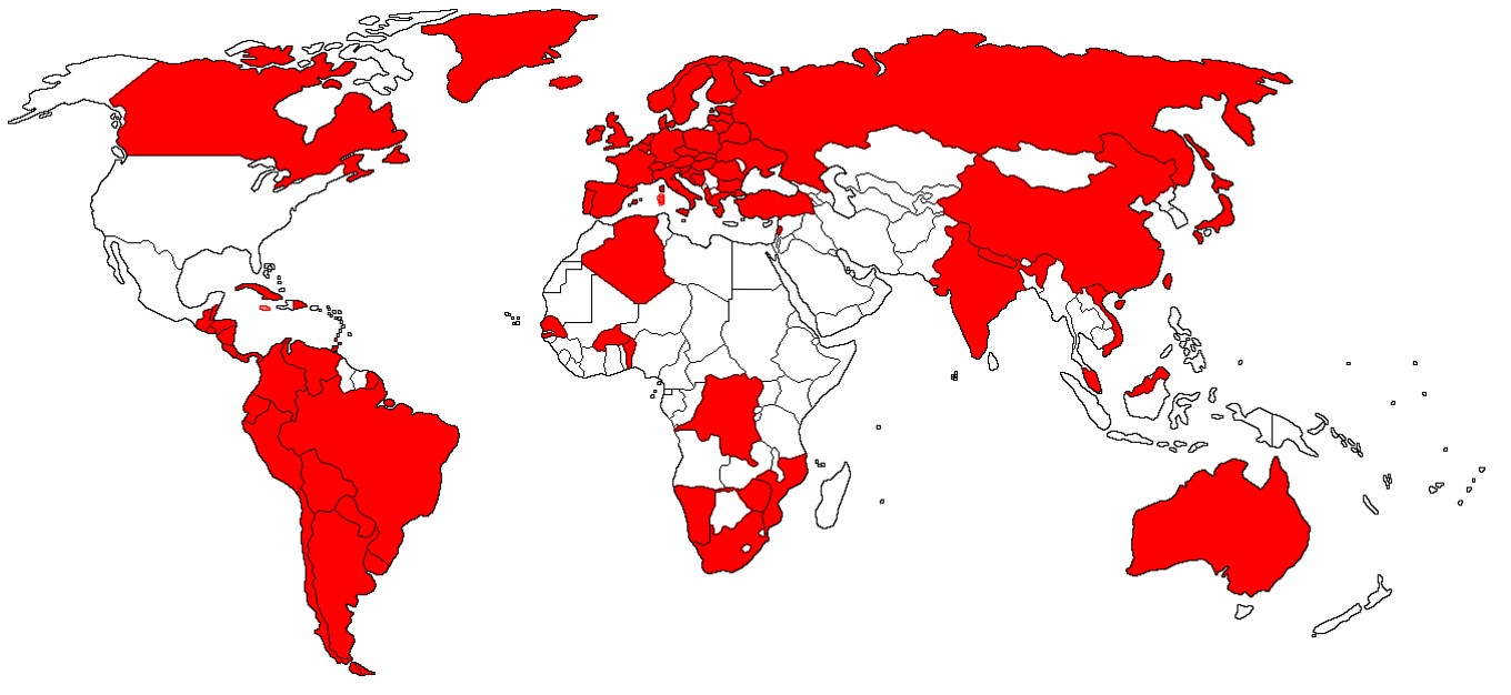 La institución realiza una importante labor en la gestión internacional, que aporta considerablemente a la economía del país. Para que se tenga una idea, al cierre del año 2015 el pago de sociedades extranjeras a la ACDAM alcanzó los 111.688,84 pesos. El siguiente mapa muestra los contratos firmados con otros países (179 en total en 95 asociaciones). Mientras, se hacen negociaciones con otras 24 naciones, para la misma cantidad de asociaciones.