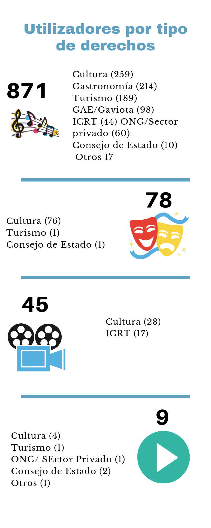 En el caso del licenciamiento, para llevar a cabo el proceso, la entidad cuenta con 51 representantes distribuidos en todo el país, quienes se encargan de negociar y tramitar la firma de los contratos-licencias con los utilizadores radicados en el territorio a su cargo. En total existen 1023 contratos, y los principales empleadores son cultura, gastronomía, turismo, GAE/Gaviota, el Instituto Cubano de Arte e Industria Cinematográficos (ICRT), organizaciones no gubernamentales y sector privado, el Consejo de Estado, entre otras.