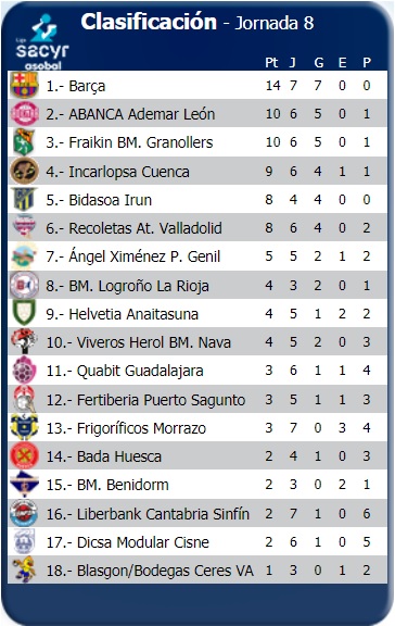 Para la novena fecha, el sábado 17, está previsto el partido entre el Fertiberia Puerto Sagunto y el Fraikin BM Granollers, conjunto, este último, con un excelente desempeño en lo que va de temporada, por lo cual debe imponerse ante los valencianos.