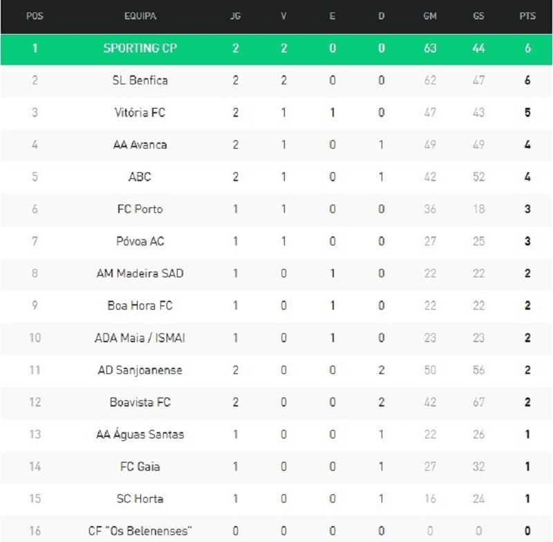 Tras dos fechas, aún incompletas, el Sporting CP se ubica en la posición cimera y el FC Porto, que jugará este domingo ante el Ada Maia, marcha virtualmente en la sexta posición.