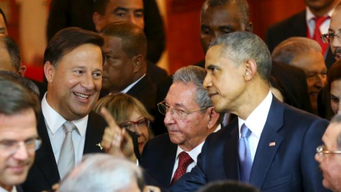 El presidente cubano Raúl Castro y Barack Obama, presidente de los Estados Unidos se saludan en la Cumbre de las Américas, junto al presidente de Panamá. (Foto: Reuter).