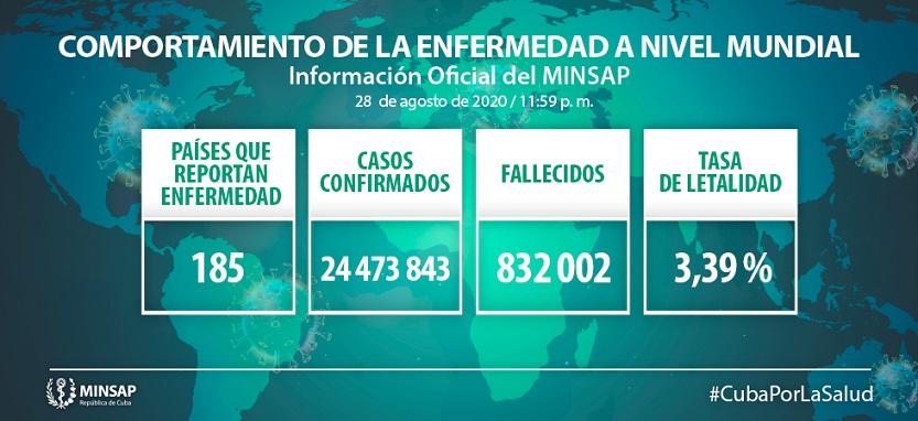 Hasta el 28 de agosto se reportan 185 países con casos de COVID-19, asciende a 24 millones 473 mil 843 los casos confirmados (+ 269 mil 157) y 832 mil 002 fallecidos (+ 5 mil 912) para una letalidad de 3,39 (-0,02).