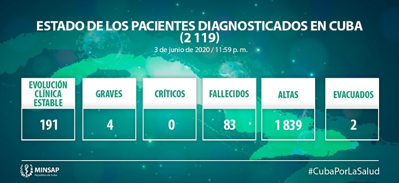 De los 2 mil 119 pacientes diagnosticados con la enfermedad, se mantienen ingresados confirmados 195 y de ellos 191 (97,9%) presentan evolución clínica estable. Se acumulan 83 fallecidos (ninguno del día), dos evacuados y mil 839 pacientes recuperados (9 altas médicas en el día de ayer). Se reportan cuatro pacientes en estado grave.