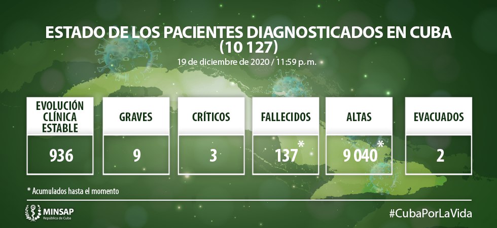 - Ciudadano cubano de 48 años de edad, del municipio Cienfuegos, provincia Cienfuegos. Caso con fuente de infección en el exterior. Se mantienen en vigilancia: 9 contactos.