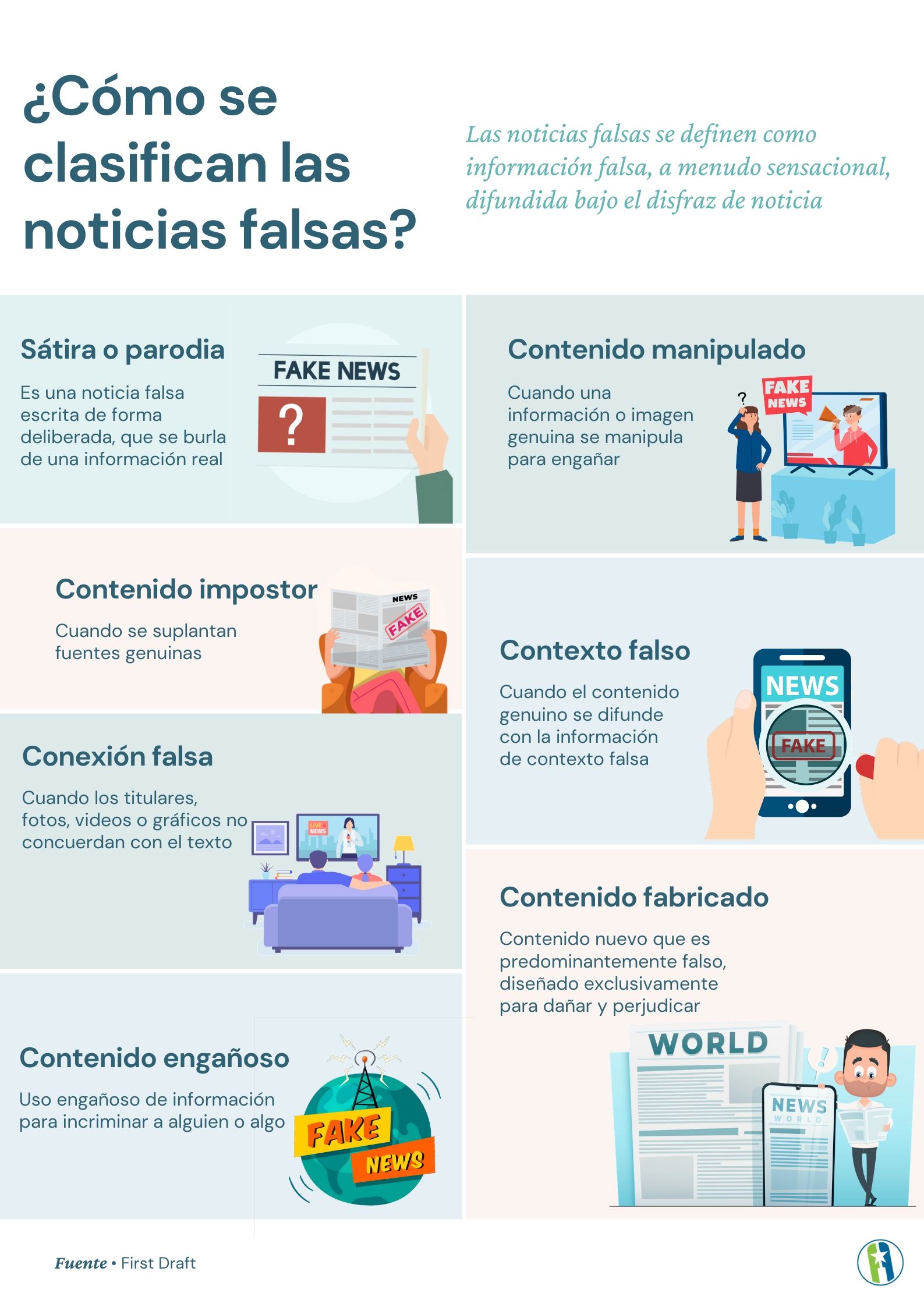 Entre las principales características de las noticias falsas se encuentra la estructura que presentan: pueden ser escritas en forma de burla, manipular los contenidos multimedia (imágenes, videos, audios, gráficos), suplantar fuentes de información o cambiar el contexto en que se desarrolla la noticia.