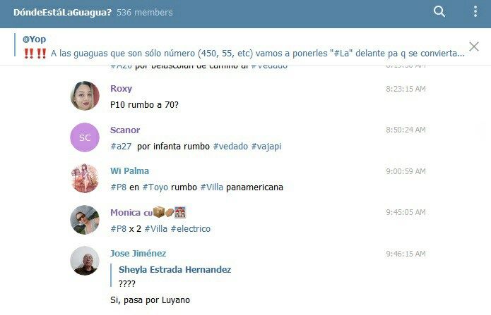 La vida de los cubanos se ha ido incorporando cada vez más a la red de redes desde el inicio de la conexión por datos móviles en el país. Una de las transformaciones aparejadas a la incursión en la Web es el surgimiento de espacios como @DóndeEstáLaGuagua que es un: “Grupo NO INSTITUCIONAL (sic), colaborativo y sin ánimos de lucro. Su éxito depende de la solidaridad de todos sus miembros y sus deseos de ayudar a que todos sepamos DÓNDE ESTÁ LA GUAGUA!! (sic)”, según aclara la información de presentación en Telegram.