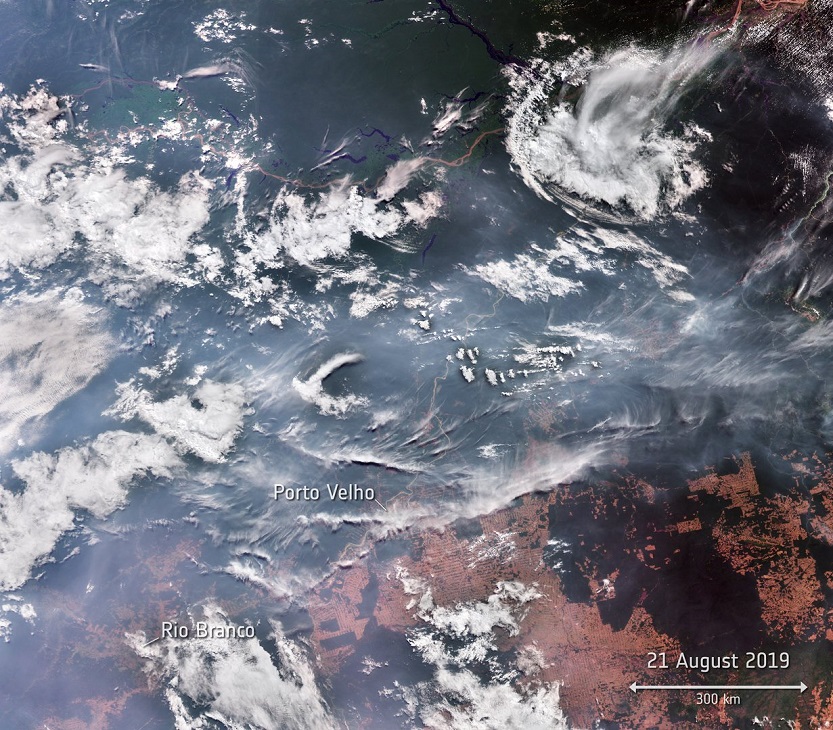 Una cantidad sin precedentes de incendios tuvo lugar durante este año en la selva amazónica de Brasil. En esta imagen, capturada el 21 de agosto de 2019 por elCopernicus Sentinel-3, se pueden apreciar claramente los fuegos y las columnas de humo.