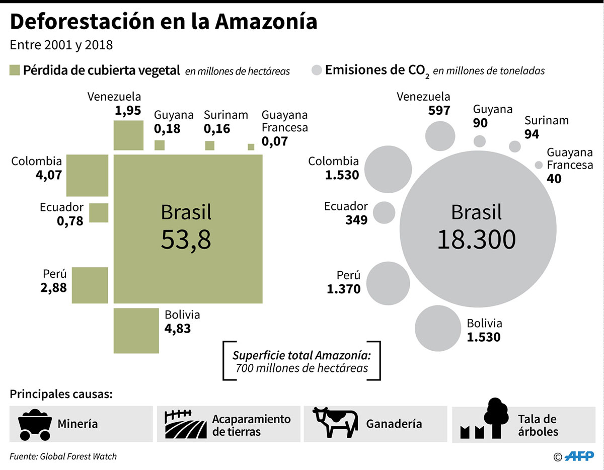 Recientemente, esta área boscosa del planeta ha sufrido daños incalculables debido a incendios forestales que llamaron la atención de gobiernos y organizaciones internacionales al respecto, así como críticas al gobierno de Bolsonaro por no hacer lo suficiente para detener los incendios deliberados para expandir las zonas de pastura.