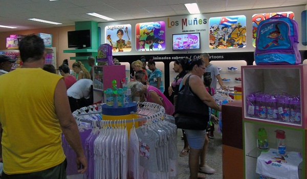 Aquí se está haciendo realidad el sueño de llevar a los niños productos utilitarios con la imagen de los personajes de los dibujos animados cubanos. Es un esfuerzo conjunto que hemos venido llevando a cabo con las cadenas nacionales de tiendas Caracol y Tiendas Caribe (antes TRD) que han destinado un espacio en algunas de sus unidades, como esta en la que hoy comienza el proyecto que es de Caribe, pero existe también en Galerías Paseo, en 23 entre N y P y en muchos de los espacios de Caracol, como la Villa Panamericana donde se inauguró la experiencia al inicio del verano. Este espacio, la juguetería Arcoiris, de Tiendas Caribe, tiene una ubicación privilegiada, es un comercio tradicionalmente muy visitado y con muy buenas condiciones.