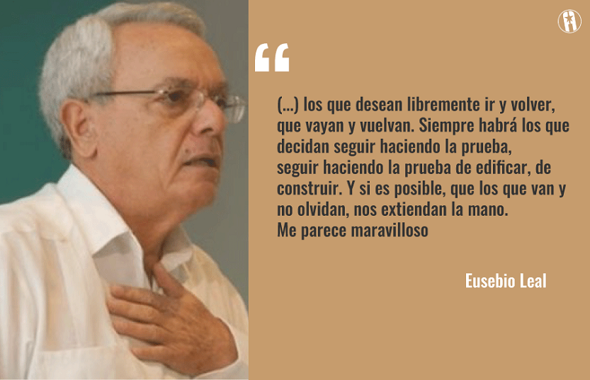 La Emigracion Tiene muchos caminos,quienes transitan en ellos es como dijiera nuestro Querido Eusebio Leal, un Hombre extremadamente sencible, Humilde, honesto y sincero, un perfecto maestro para toda una sociedad como es , un perfecto ser humano en orientarnos sobre la historia y nuestra cultura cubana,el marcho, en lo personal , partio  con mi Mayor admiracion y Respeto, escuchar su Voz calidad y con esa elocuencia tan facil y generosa, era como haber escuchado el sonido de la lluvias,en el mes de mayo,me encantaba escucharlo como hoy lo hago,su timbre de voz muy pecualir y personal dejaba a cualquier ser humano a su alrededor permitirle soñar y sentirse en el pasado. y Sobre estas Palabras de la EMIGRACION es como las mismas Aves y las golondrinas, es como una misma gaviota que podria volar quizas en una orrilla de un Puerto y de ser capaz sin ella darse cuenta de viajar al mismo mar pero en otras Tierras, siendo siempre la misma GAVIOTA," Solo aquellos Cobardes, Traidores a sus Condiciones Humanas y a ellos mismos ,seran siempre los arrepentidos de cada accion de ellos en lo Personal y serian siempre los mismos Enemigos de su patria y pueblo como enemigos eternos de la sociedad y pais que los acoja,porque hay muchas maneras de delinquir,de cometer injusticias y de abusar de su misma Condicion como emigrante, ese ,aunque mucho nunca seria capaz de comprar con ese poder economico,politico y social la felicidad , ni la condicion humana que fue capaz de Perderla cuando se decidia a ya traicionar a su mismos Valores y a la condicion Humana en que se convirtio en un Emigrante, en un Gitano, en un Traidor a la Raza Humana, Hasta a la misma Naturaleza. Eusebio Leal tu estas como Muchos seres Humanos y Cubanos en Cuba siempre, en esas calles , en ese cielo, en ese pueblo, en la Historia misma de CubA  " alli donde quieras que estes Hoy disertando con tu bella elocuencia, ! GraciasEusebio Leal Tu eres Cuba , eres la habana Tambien , eres sus calles y adoquines.! Gracias !
