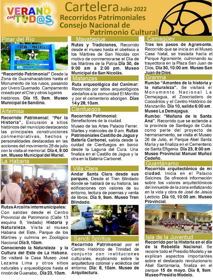 En otro orden, el Consejo Nacional de Patrimonio Cultural, tiene preparado algunos recorridos patrimoniales por diversas ciudad de Cuba, además de celebrarse en La Habana la 22 edición de Rutas y Andares de la Oficina del Historiador.