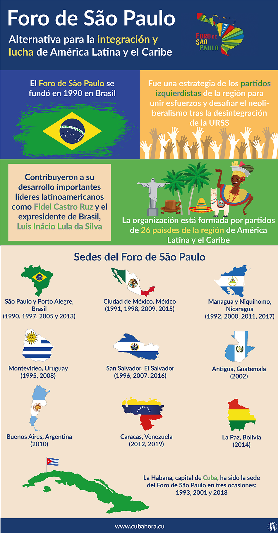 El Foro de São Paulo surgió en el año 1990 como iniciativa del Comandante en Jefe, Fidel Castro Ruz, y el expresidente de Brasil, Luiz Inácio Lula Da Silva. Desde un inicio constituyó un espacio de diálogo, retroalimentación, intercambio de experiencias y construcción de la necesaria unidad de las fuerzas progresistas y de izquierda de América Latina y el Caribe.