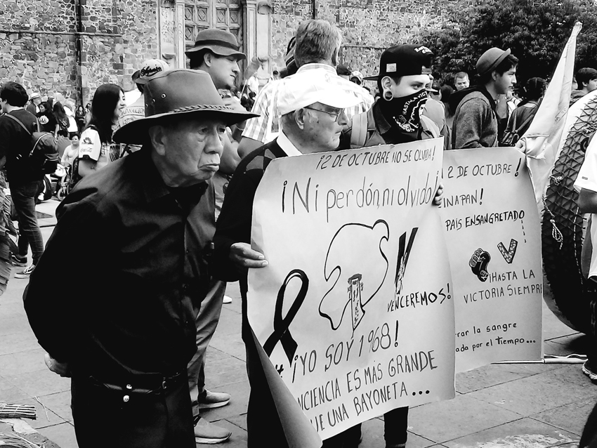 Durante casi dos horas han estado llegando manifestantes hasta el Palacio de Gobierno, en el corazón de la ciudad. Un ímpetu común los acompaña a todos: la resistencia del señor de la pancarta va en cada uno de ellos. La joven del pañuelo negro parece multiplicarse hasta en la bandera: muchas manos llevan el estandarte de luto y conmociona ver la ausencia del rojo y del verde alrededor del águila icónica. Un minuto de silencio recuerda las víctimas, el primer disparo, los cadáveres en la explanada, la impunidad, los desaparecidos, las injusticias, el descontento, las esperanzas: ¡Tlatelolco! ¡El síndrome Tlatelolco!