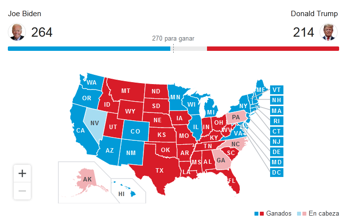 También la amplia participación en general ha dificultado el conteo de boletas, aunque quedan ya solo cinco estados por definirse según las predicciones: Pensilvania, Carolina del Norte, Georgia , Alaska y Nevada. En los cuatro primeros van ganando los republicanos, y en el último, por poco margen, los demócratas. Ayer Joe Biden ganó tres estados decisivos: Arizona, Michigan y Wisconsin, para así situarse a la cabeza con 264 supuestos votos electorales, mientras Donald Trump quedaba con 214.