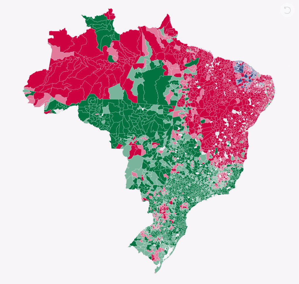 Así votó Brasil: El rojo es Haddad, el verde Bolsonaro y azul Ciro Gomes (Fuente: Telesur).