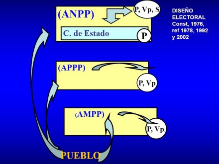 He marcado con el color amarillo los órganos de elección popular directa conforme a lo que tenemos hoy: las Asambleas del Poder Popular, y en color naranja el Consejo de Estado, que tiene un carácter especialísimo, porque se vincula al Jefe de Estado, pero nace de la Asamblea, sus integrantes son diputados, y representa al Estado; entonces tiene una doble función.