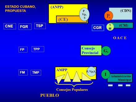 En este esquema propuesto, veo correcta la figura como Poder del Estado al Consejo Nacional Electoral, como instrumento auditor de la voluntad del pueblo ante las urnas. También es mi criterio “que cambie el esquema electoral, sometiendo a votación directa y secreta por el pueblo desde la base (circunscripción), las candidaturas para las figuras de Presidente del Consejos de Estado y Ministros, (no Presidente de la República) y del Presidente de la ANPP. ¿Cómo?!.. ,primeramente se convocarían a elecciones para delegados de circunscripción, diputados de la Asamblea Nacional, Presidente de la Asamblea Nacional y su  Vicepresidente, y una vez conformada la Asamblea Nacional , designa a los Gobernadores, Vicegobernadores y Secretario .Los candidatos a  Presidentes,  Vicepresidentes y secretarios de las Asambleas Municipales ,una vez conformada dicha asamblea municipal son reafirmados por los Diputados de la Asamblea Nacional   ( cuya correlación de diputados por habitantes estará regida por el CNE en una proporción de no más de 1-2 diputados  cada 40 mil habitantes por municipio y trabajarán a tiempo completo 30 días por trimestre en comisiones de trabajo)  y estos forman parte de  sus respectivos consejos y asambleas . En un segundo momento, a propuestas de las organizaciones de masas, y de la Asamblea Nacional del PP, se proponen las candidaturas a Presidentes de los Consejos de Estado y Ministros, Vicepresidente del Consejo de Ministros que son sometidos a votación nacional, los que a posterioridad designan a los Secretarios del CE y CMin