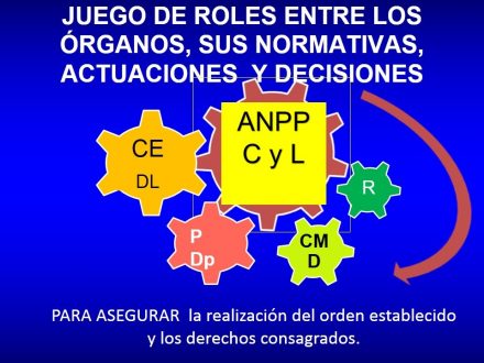 En cuanto a las facultades de creación jurídica normativa de los órganos superiores y el diferente rango entre ellas, este esquema puede ilustrar, a partir del distinto tamaño de cada rueda dentada, la diferencia jerárquica entre tales disposiciones, y la obligación de sujeción que tienen unos órganos respecto a otros y las normativas que de ellos emanan.
