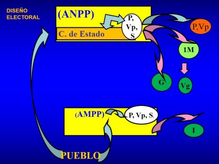 Respecto a la esfera electoral, está el tema de los órganos elegibles, y he puesto en azul claro las flechas que suponen elección y, en rosado, las flechas que suponen designación. Y hay un elemento que debe quedar claro, no es lo mismo en un diseño democrático ser electo que ser designado.