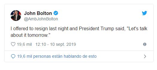 "Seamos claros, renuncié yo tras haber ofrecido hacerlo anoche", cita a Bolton el reportero de Washington Post Robert Costa. Asimismo, el presentador de Fox News Brian Kilmeade afirmó haber recibido el mismo mensaje.