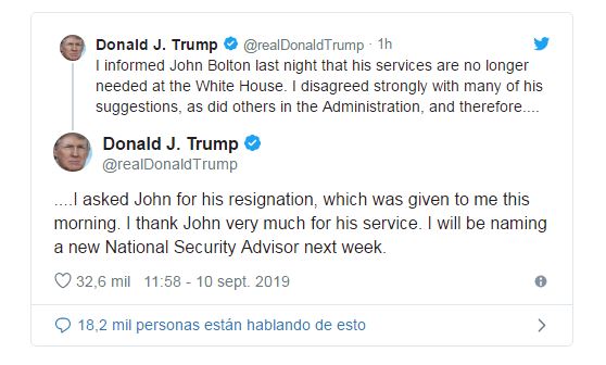 "Anoche informé a John Bolton de que sus servicios ya no son necesarios en la Casa Blanca. No estaba de acuerdo con muchas de sus sugerencias, al igual que otros en la Administración, por lo que le pedí a John su renuncia, que me fue dada esta mañana ", ha comunicado el mandatario a través de su cuenta de Twitter.