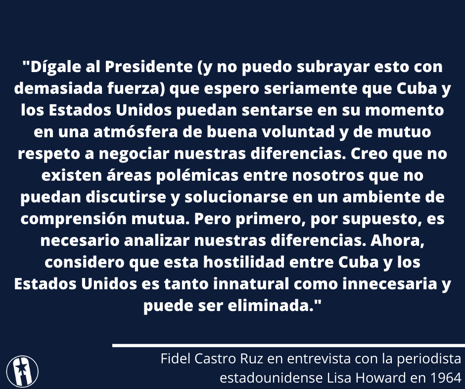 Creo oportuno recordar en este contexto que, a lo largo de 50 años, el Comandante en Jefe Fidel Castro expresó en varias ocasiones la disposición de Cuba a discutir y resolver las diferencias con los Estados Unidos a través de negociaciones y sin renunciar a nuestros principios; y que, al asumir la dirección del gobierno, el General de Ejército Raúl Castro confirmó la voluntad de Cuba de normalizar las relaciones con los Estados Unidos sobre la base de la igualdad.