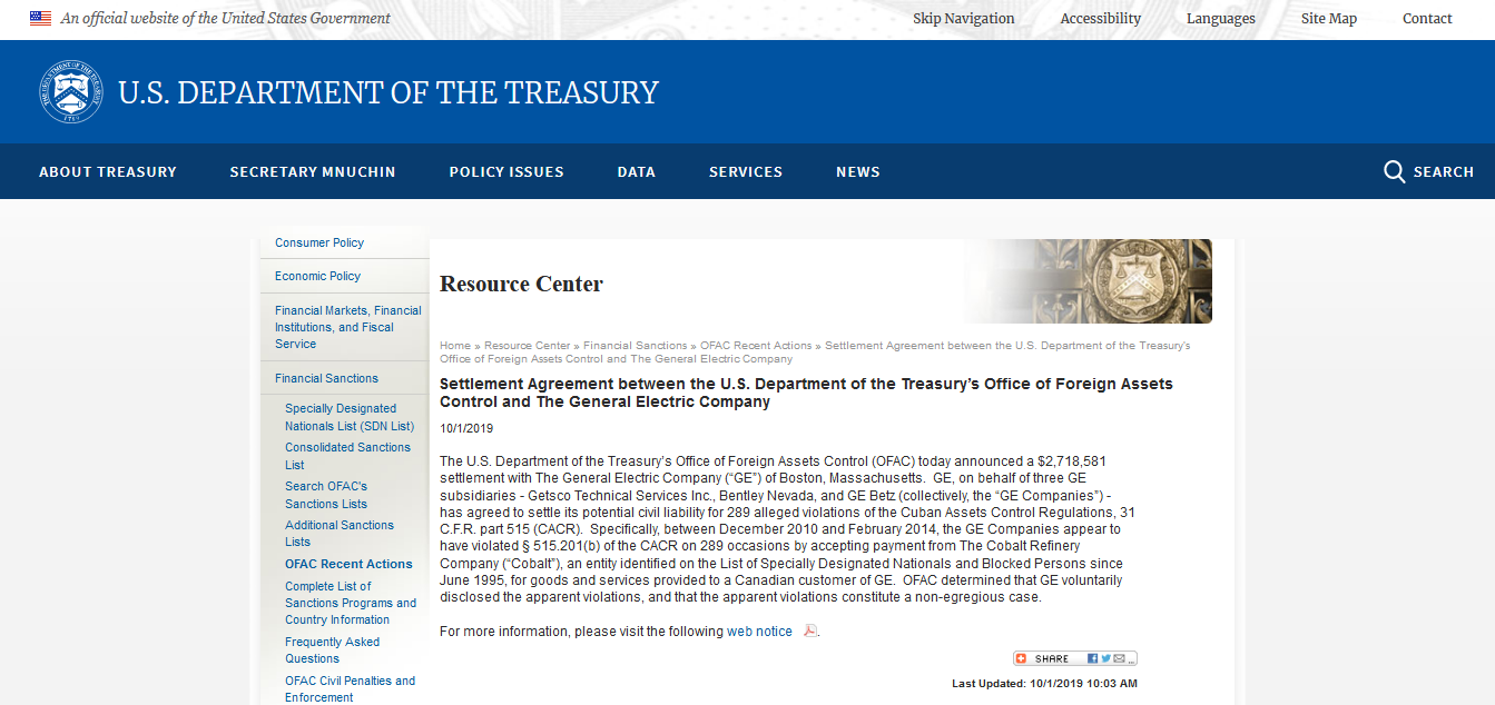 La firma norteamericana con sede en Boston, Massachusetts, acordó pagar la deuda de  $2,718,581 a nombre de tres subsidiarias (Getsco Technical Services Inc., Bentley Nevada y GE Betz), las cuales incurrieron en 289 violaciones del Reglamento de Control de Activos Cubanos desde diciembre de 2010 hasta febrero de 2014.