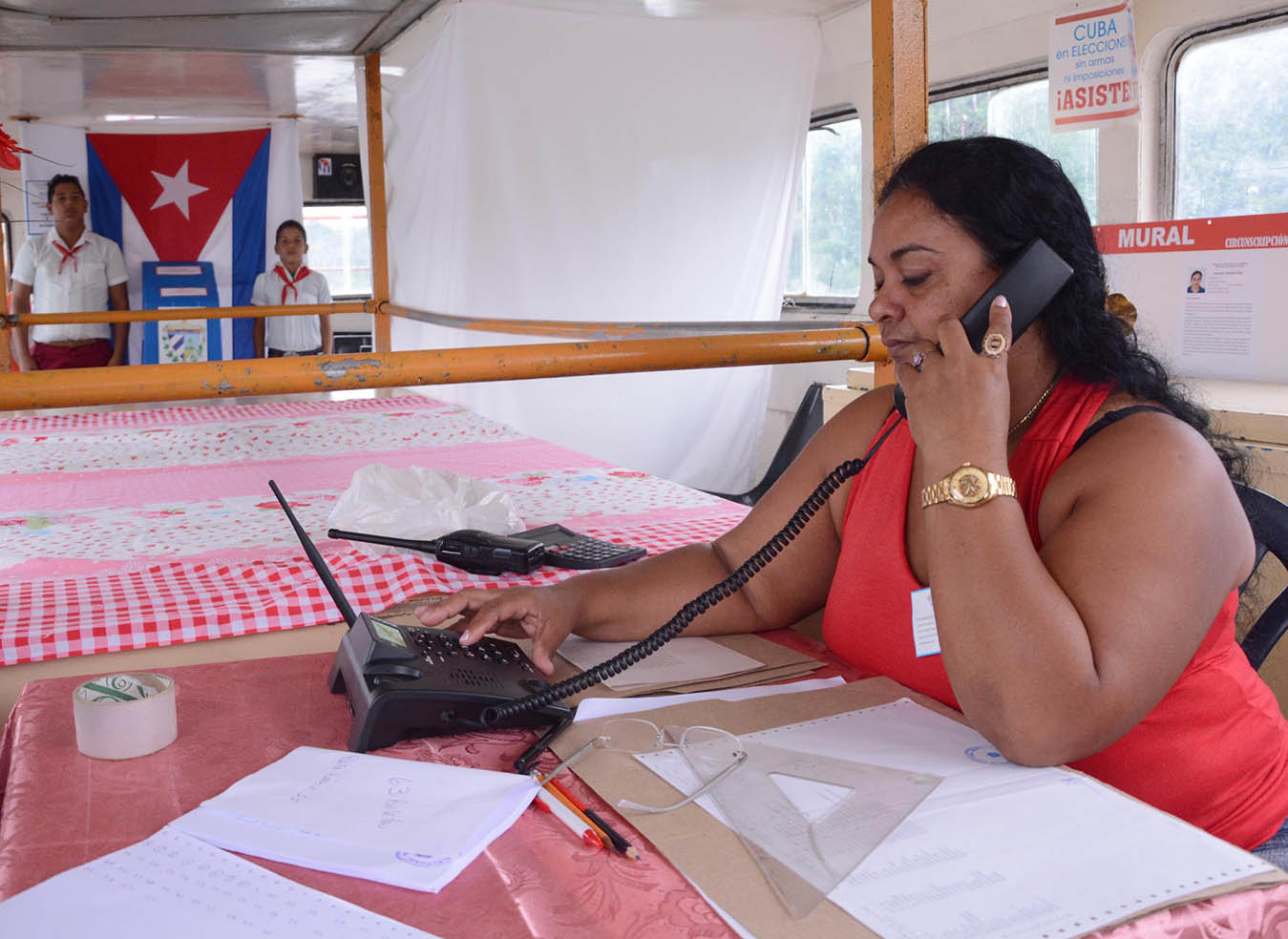 Los campesinos de la zona montañosa llegaron hasta los márgenes del Lago Hanabanilla para ejercer su derecho al voto en estas elecciones a delegado municipales. Allí, en la embarcación, las autoridades electorales disponen de diferentes medios de comunicación con la Comisión Electoral Municipal, entre ellos la telefonía fija alternativa.