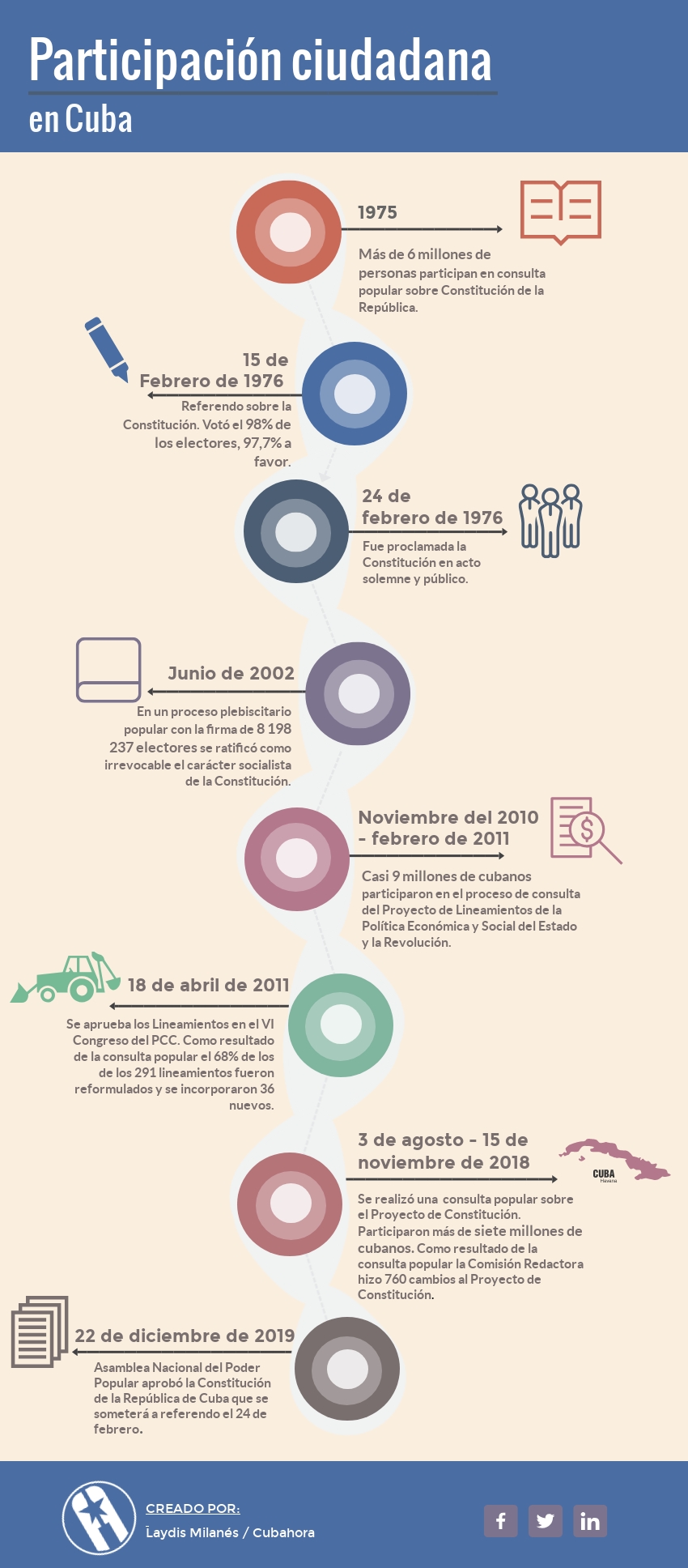 Muy actualizado el trabajo de Daniel y Leydis, sobre todo para los que por primer vez estaremos en un Referendo Constitucional, sería muy importante además realizar una cronología de lo sucedido hace 150 años en Guáimaro, que son las génesis de nuestro proceso electoral. Como cultura para todos.