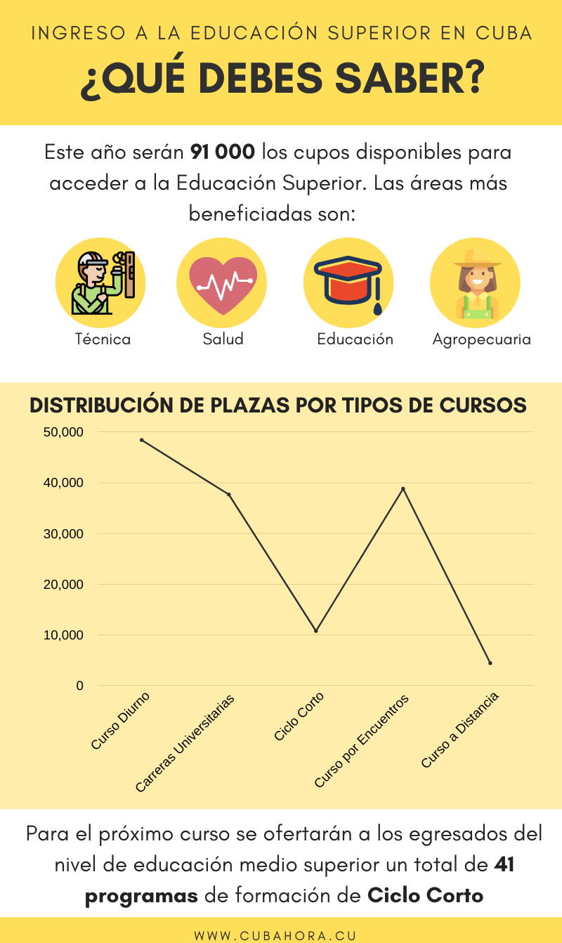 Este 2020 la Educación Superior en Cuba hace historia: por primera vez se le ofrecen plazas para el acceso a las universidades a todos los graduados de preuniversitario en el país. Serán 91 000 los cupos disponibles, de los cuales se otorgarán 10 mil 736 plazas para la Educación Superior de Ciclo Corto. Así lo hizo saber Reynaldo Vázquez Zaldívar, director general de pregrado del Ministerio de Educación Superior (MES) en el programa televisivo Mesa Redonda.