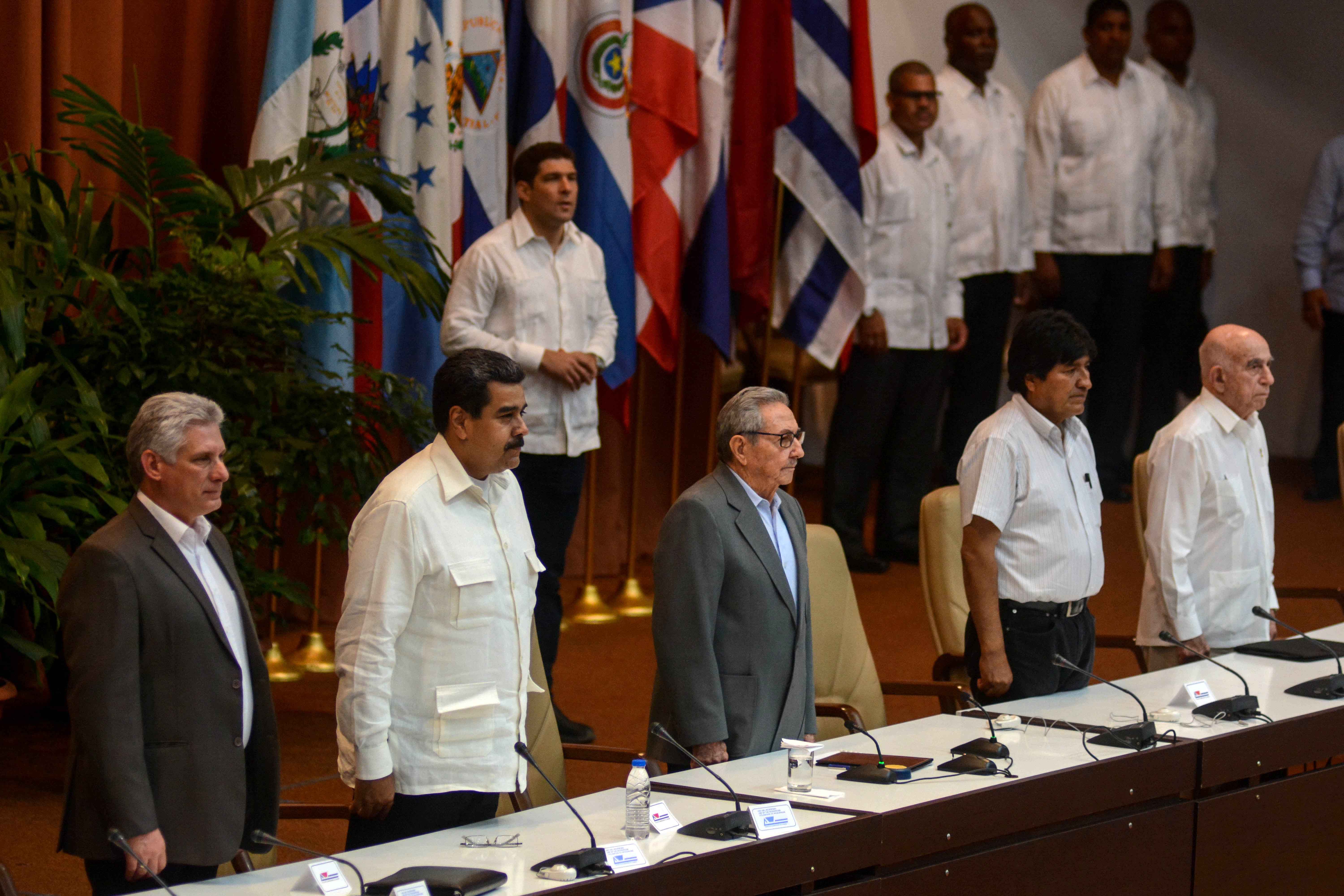De izquierda a derecha Miguel Díaz-Canel, Presidente de los Consejos de Estado y de Ministros; Nicolás Maduro, Presidente de la República Bolivariana de Venezuela; el General de Ejército Raúl Castro, Primer Secretario del Comité Central del Partido Comunista de Cuba (PCC); Evo Morales, Presidente del Estado Plurinacional de Bolivia; y José Ramón Machado Ventura, segundo Secretario del PCC, durante la sesión de clausura del XXIV Encuentro del Foro de Sao Paulo, en el Palacio de Convenciones (Foto: ACN).