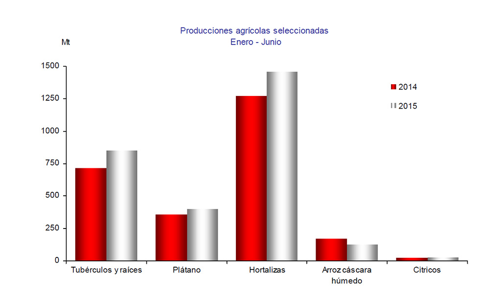 No obstante, los datos del primer semestre del 2015 sobre la producción agropecuaria reflejan una mejoría con respecto al año anterior. Según la ONEI, la producción de viandas se incrementó en 176,9 miles de toneladas, lo que significa el 16,5%; mientras que la producción de hortalizas creció un 14,6%. Otros sectores como la producción ganadera también presentaron avances.